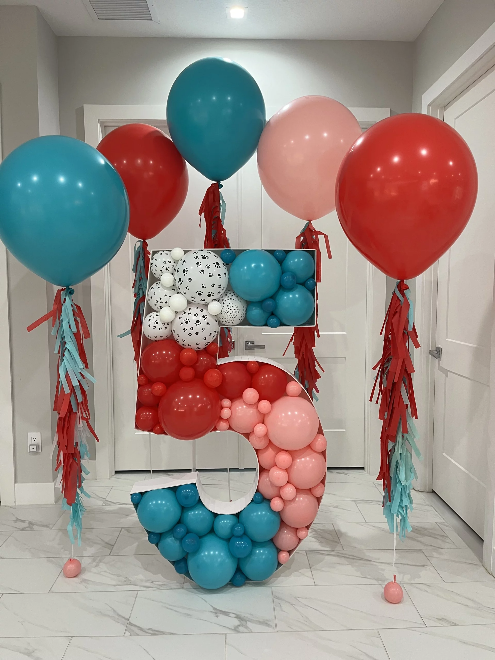 Items included: Theme/colors of choice. 5 jumbo balloons with tassels and 5ft mosaic balloon number. Delivery fee applies based on distance of travel. Available for pickup